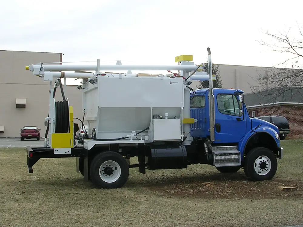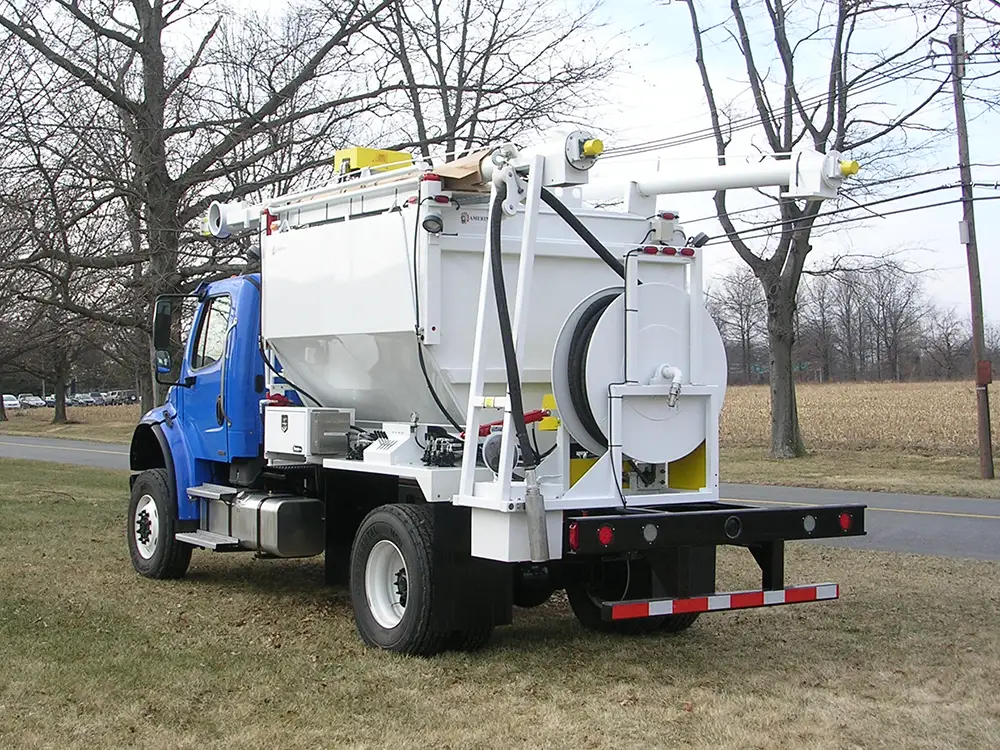 This truck features a compact 7-ton AN-Prill body and is equipped with a 115-gallon fuel oil tank mounted at the rear. For enhanced safety and convenience, it includes a single-side hydraulic guard rail. Designed for operations in wet environments, this truck is fitted with a dewatering hose reel. The ANFO is delivered by an 18-foot overhead auger, which is capable of an output of 500 lbs per minute. All functions are managed by a simple electric-over-hydraulic control system.